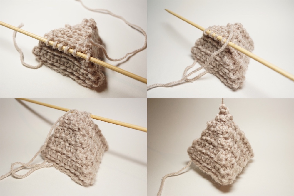 Each layer of a solid-knit is made of rows of stitches (left). To form a new row, one runs yarn across the latest row of loops on the top layer (center) and pulls the yarn through both these loops and loops from a row one layer down (right).